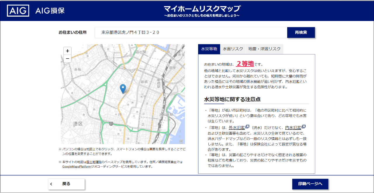 ハザードマップで一度は身のまわりの災害リスクを調べたことがあるという人は多いかもしれない。AIG損保が提供するマイホームリスクマップでは、地図上で水害や地震・津波のリスクがどのくらいなのか、ハザードマップ上で確認しながら、その地域がほかの市区町村に比べて相対的にどのくらい水災リスクが低いか高いか、「等地」によって確認することができる。
