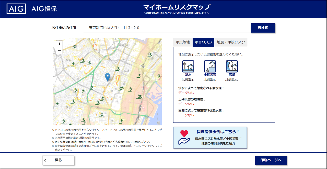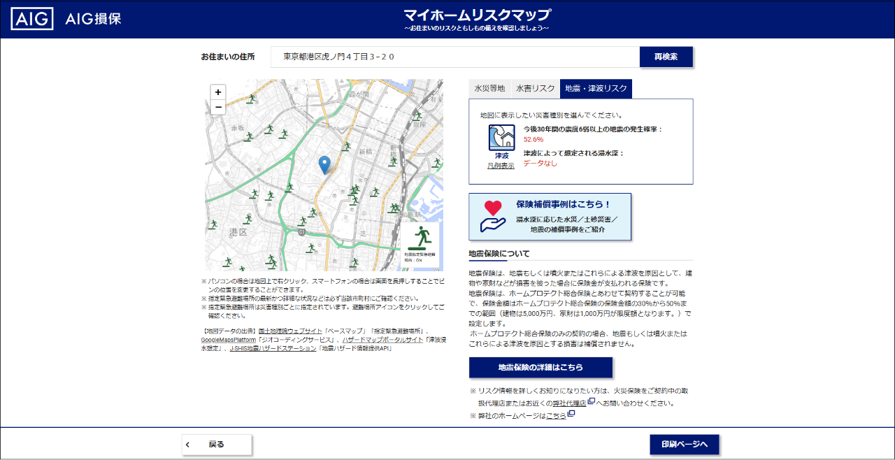 たびたび発生する台風や集中豪雨で、河川の氾濫や土砂災害、道路の冠水など、生活や生命がおびやかされる自然災害のリスクは年々高まっている。「自分たちが暮らす地域は大丈夫なのか?」そう思ったとき、住所や郵便番号を入力するだけで水害リスク*1だけでなく地震・津波のリスクを「マイホームリスクマップ*2(https://sb-appvantage-pro3.hclvoltmx.net/apps/AIGRiskMap/)」で事前に把握することができる。